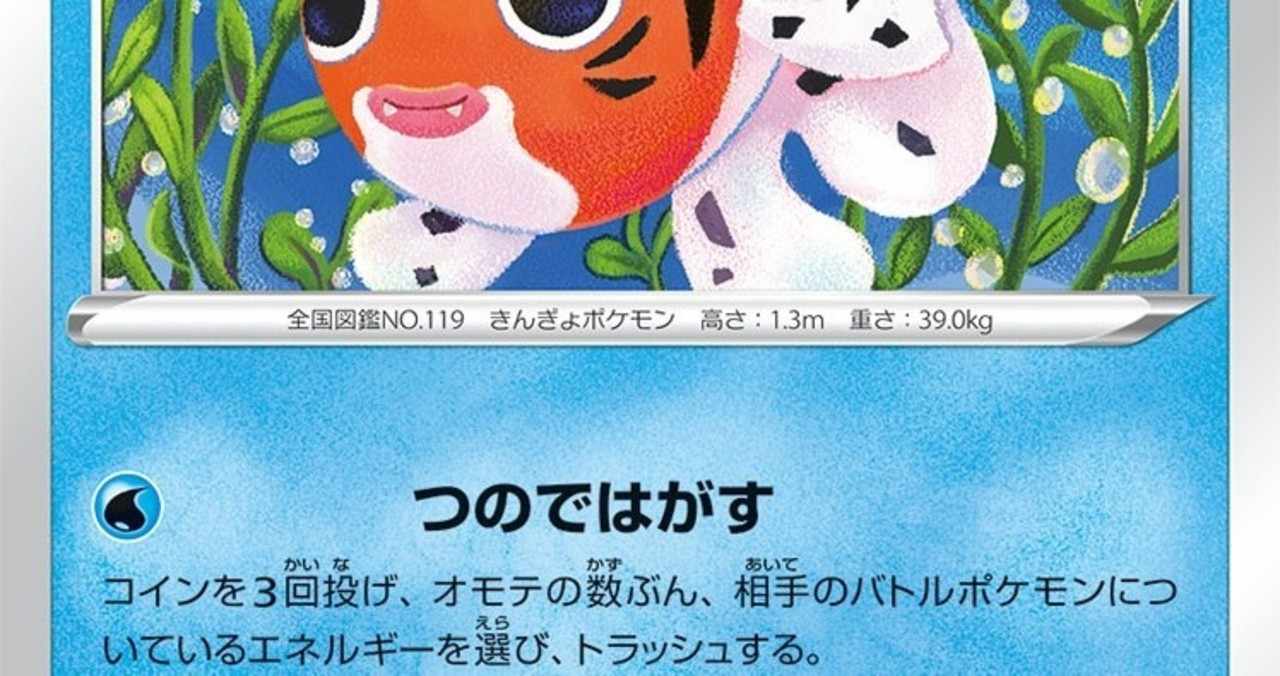 高さ:1.3 m 重さ:39 kg. ドリルのように とがっている ツノで いわはだを くりぬき じぶんの すを つくっている。. アズマオウ no.119 タイプ:みず 特性:すいすい(雨の時に素早さが2倍になる) みずのベール(やけど状態にならない) 夢特性:ひらいしん(電気タイプの技を無効化し、特攻が1段階上がる 電気タイプの野生ポケモンと出会いやすくなる(第8世代から)) 体重:39.0kg(けたぐり・くさむすびの.