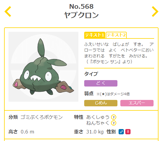 リサイクルヤブクロンに変身させたぜ! ヒメリ持ちですりかえ決めるぜ! 『ヤブクロンのねんちゃく』 あくしゅうヤブクロンを用意しなおしたぜ! — 白桃 (@hakuto_u) November 26, 16. ヤブクロンの進化・個体値早見一覧表ならポケモンgo攻略の図鑑&最新攻略情報サイト | ポケマピ!ポケモンgoの最先端の. 概要 うんたんという鳴き声が特徴。モデルはゴミ袋である。つまり「生きたゴミ袋」。 ゴミ袋と産業廃棄物が化学変化を起こして生まれたポケモンだとされており、同じどくタイプのヘドロポケモンと同じような境遇である。 ヤブクロンの口から出される息は人に.